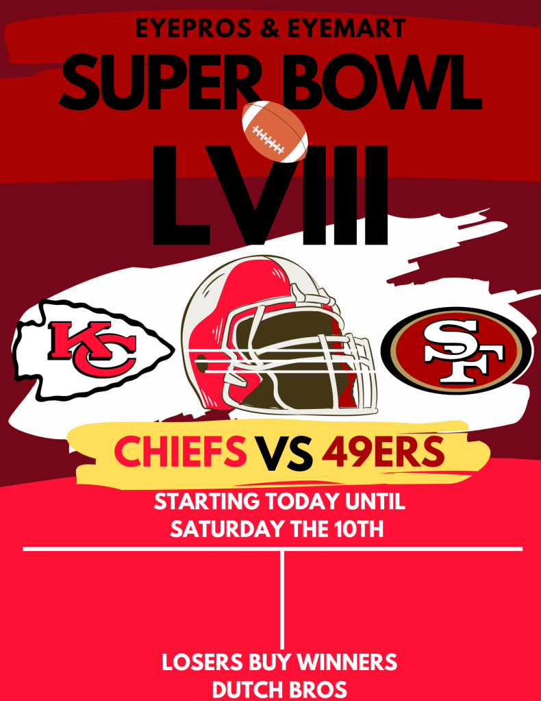 This is a simple poster I designed for a contest for Super Bowl LVIII. Names were placed under the side of the lower bracket for which ever team the person wanted to vote for. As denoted at the bottom, those whose names were on the side of the team who won the game were purchased Dutch Bros by those who chose the losing side.