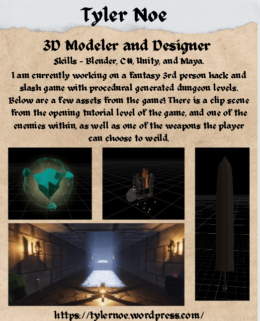 This is the poster for my Senior Showcase that was put on by my major during April 2023 a couple weeks before graduation. I design this poster to show some of my work on Crypt, the WIP game project I have been designing. The poster is meant to compliment the fantasy aesthetic of the game, and was designed to go on a large poster board which was hung from the ceiling.