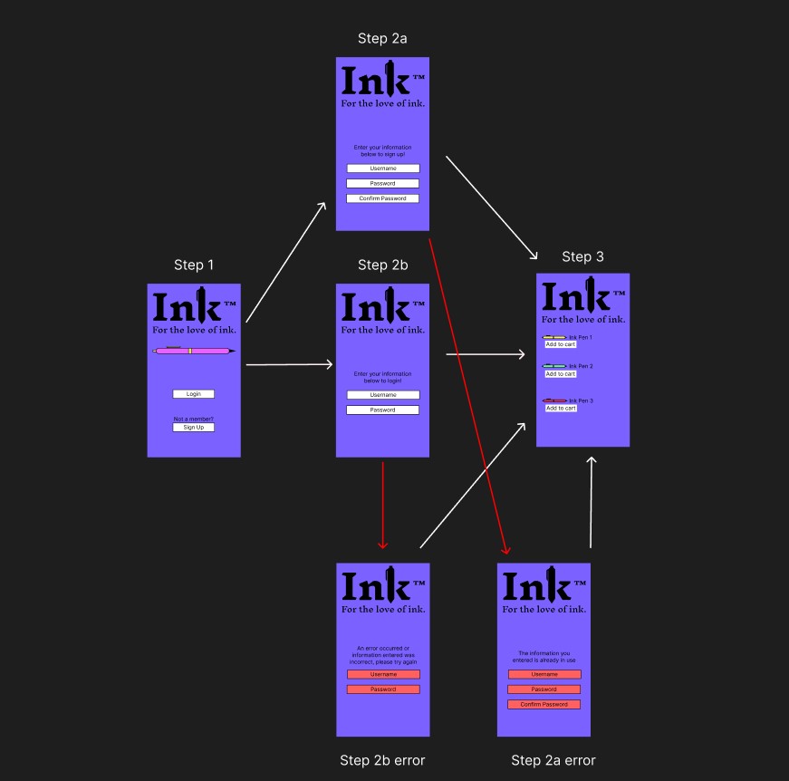 This was a simple UI and screen system I designed for a project during school in Figma. The user moves through the app in the way that the steps are ordered, laid out in a simple manner for the designers and programmers to understand. The buttons in the project are linked in the order the arrows are directing, so when clicking login it leads horizontally to Step 2b, where as a new user would be directed to Step 2a to make an account. The project was for an app that allows artists to search for, save, and purchase their favorite ink pens and other art materials.